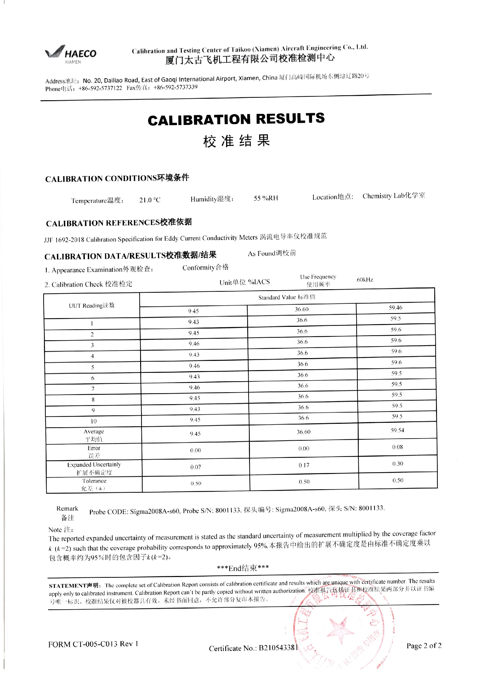 太古飛機(jī)工程檢測(cè)電導(dǎo)率儀證書